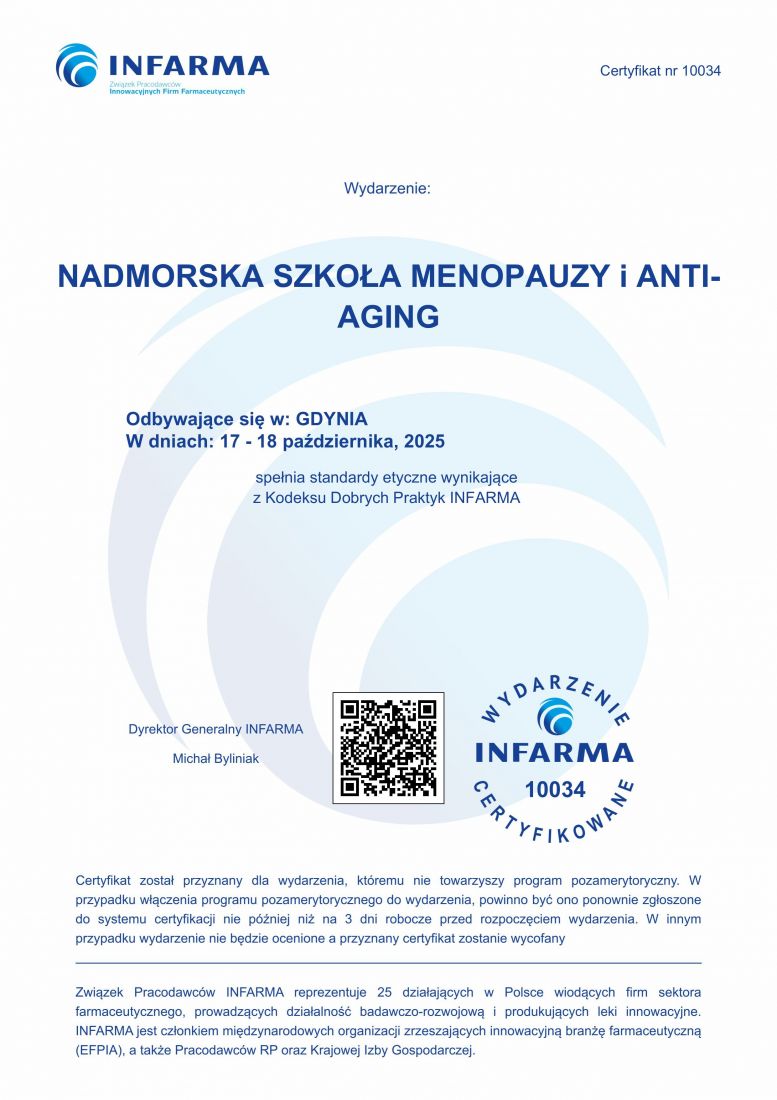 Dziękuję bardzo za udział w kolejnej już Nadmorskiej Szkole Menopauzy i Anti-Aging oraz XIII Zjeździe Polskiego Towarzystwa Menopauzy i Andropauzy (PTMA) w Gdyni w dniach 17-18.10.2025. Podczas Walnego Zebrania PTMA wybrano Zarząd Główny Towarzystwa oraz Prezesa – prof. Wojciecha Zgliczyńskiego i Wiceprezes – dr Małgorzatę Bińkowską. W Konferencji uczestniczyło 252. lekarzy różnych specjalności (najliczniejszą grupę stanowili ginekolodzy - 146 osób ), 22 wykładowców i 32 przedstawicieli firm medycznych.